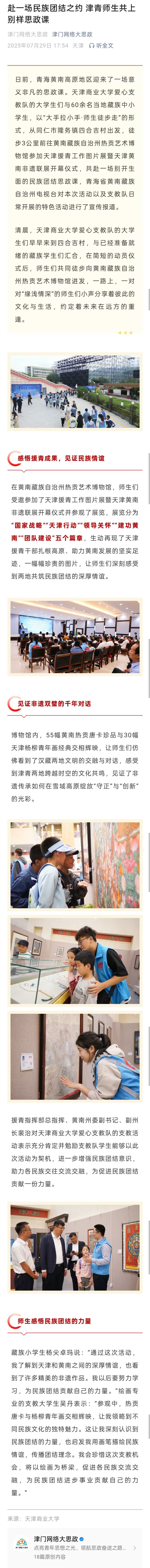 7月29日,津门网络大思政微信公众号报道学校爱心支教队开展民族团结思政课。日前,青海黄南高原地区迎来了一场意义非凡的思政课。beat365英国官方网站爱心支教队的大学生们与60余名当地藏族中小学生,以“大手拉小手·师生徒步走”的形式,从同仁市隆务镇四合吉村出发,徒步3公里前往黄南藏族自治州热贡艺术博物馆参加天津援青工作图片展暨天津黄南非遗联展开幕仪式,共赴一场别开生面的民族团结思政课,青海省黄南藏族自治州电视台对本次活动以及支教队日常开展的特色活动进行了宣传报道。