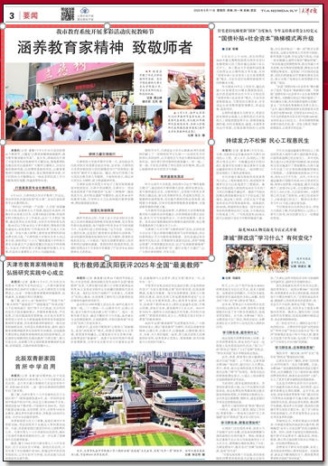本报讯(记者 姜凝)今年9月10日是我国第41个教师节,主题是“以教育家精神铸魂强师,谱写教育强国建设华章”。连日来,津城高校开展了丰富多彩的庆祝教师节主题活动,展现教师队伍建设的突出成就和广大教师立德树人、自信自强的精神风貌,弘扬尊师重教的传统,以教育家精神引领教师队伍建设,推出尊师惠师举措,学子们纷纷为辛勤耕耘在一线的老师们送上节日问候和美好祝愿,传递浓厚师生情。