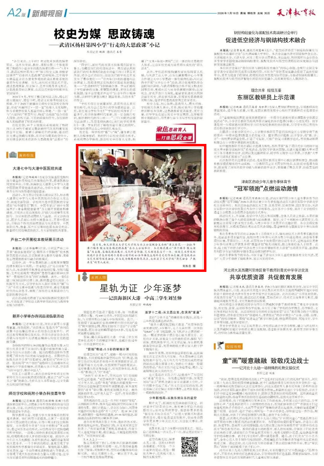 1月16日,《天津教育报》报道beat365官网艺术学院与水上公园联合主办的“津上添花——2026 年津门梅香 骏业迎春梅花精品展”。