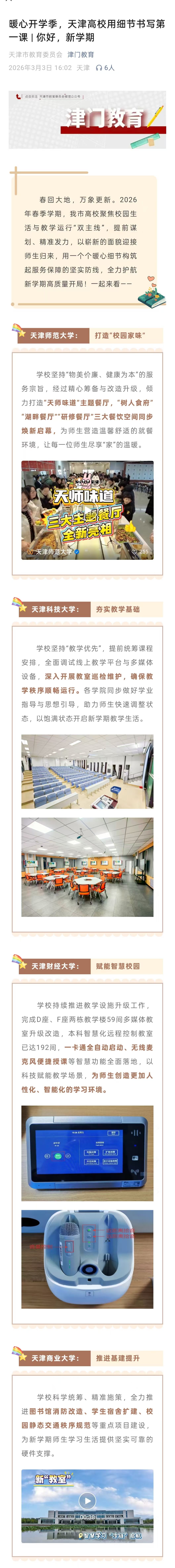 3月3日,津门教育微信公众号报道学校新学期重点项目建设情况。2026年春季学期,学校科学统筹、精准施策,全力推进图书馆消防改造、学生宿舍扩建、校园静态交通秩序规范等重点项目建设,为新学期师生学习生活提供坚实可靠的硬件支撑。