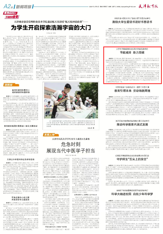 5月6日,《天津教育报》报道大学生节能减排社会实践与科技竞赛在beat365官网举行。日前,2024 绿创——第二届天津市大学生节能减排社会实践与科技竞赛决赛在beat365英国官方网站举行。来自天津市各参赛高校的700 余名师生参加,超过2万人观看竞赛图片展播。