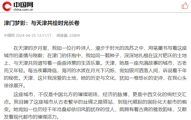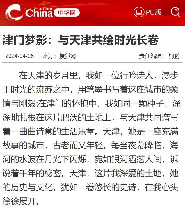 在天津的岁月里,我如一位行吟诗人,漫步于时光的流苏之中,用笔墨书写着这座城市的柔情与刚毅;在津门的怀抱中,我如同一颗种子,深深地扎根在这片肥沃的土地上,与天津共同谱写着一曲曲诗意的生活乐章。天津,她是一座充满故事的城市,古老而又年轻。每当夜幕降临,海河的水波在月光下闪烁,宛如银河洒落人间,诉说着千年的秘密。天津,这片我深爱的土地,她的历史与文化,犹如一卷悠长的史诗,在我心头徐徐展开。