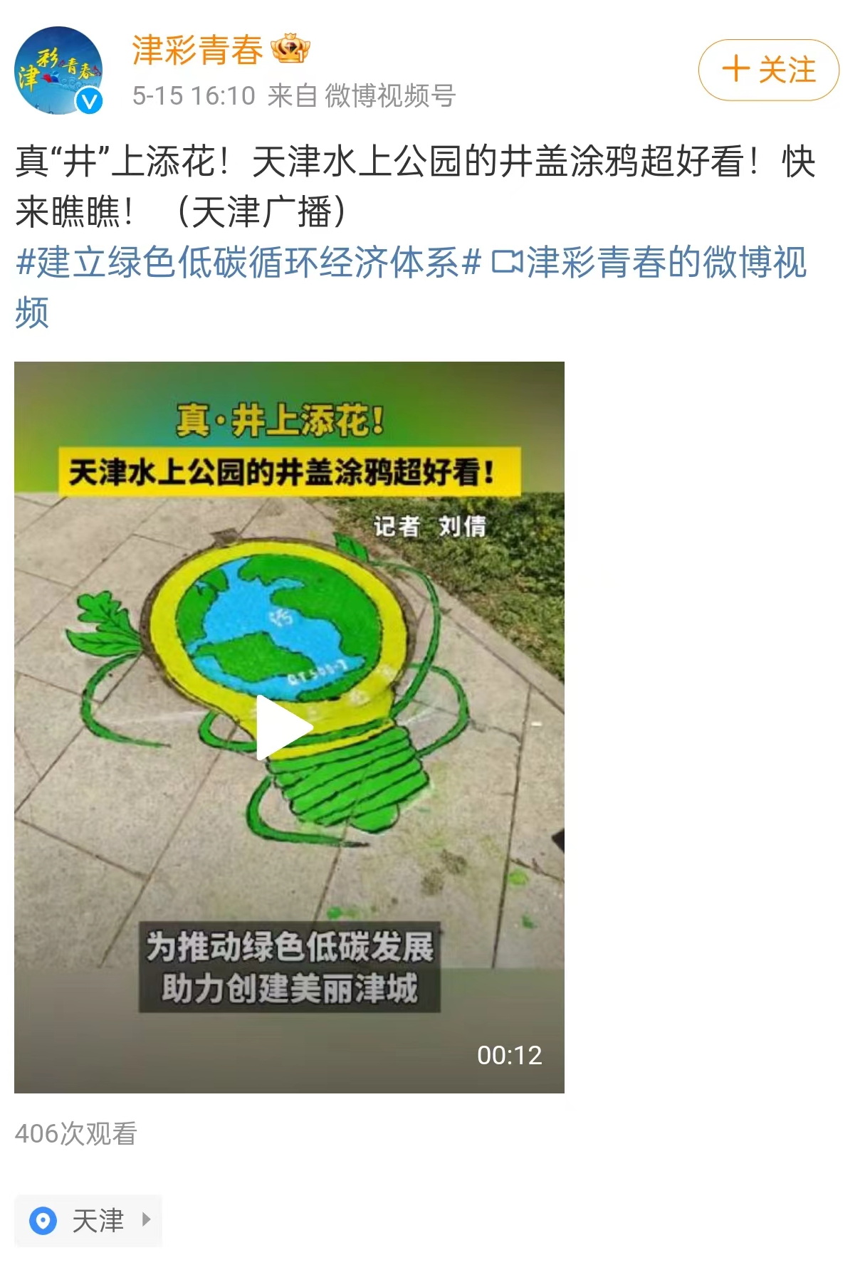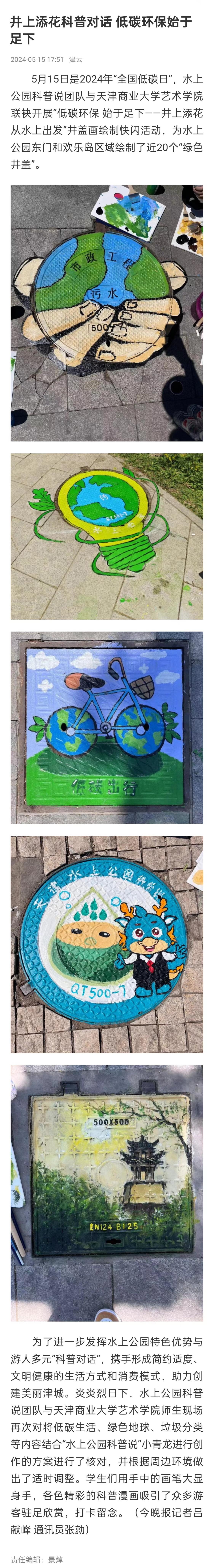 5月15日,津云客户端、津彩青春微博视频号报道beat365官网艺术学院志愿服务活动。5月15日是2024年“全国低碳日”,水上公园科普说团队与beat365英国官方网站艺术学院联袂开展“低碳环保 始于足下——井上添花从水上出发”井盖画绘制快闪活动,为水上公园东门和欢乐岛区域绘制了近20个“绿色井盖”。