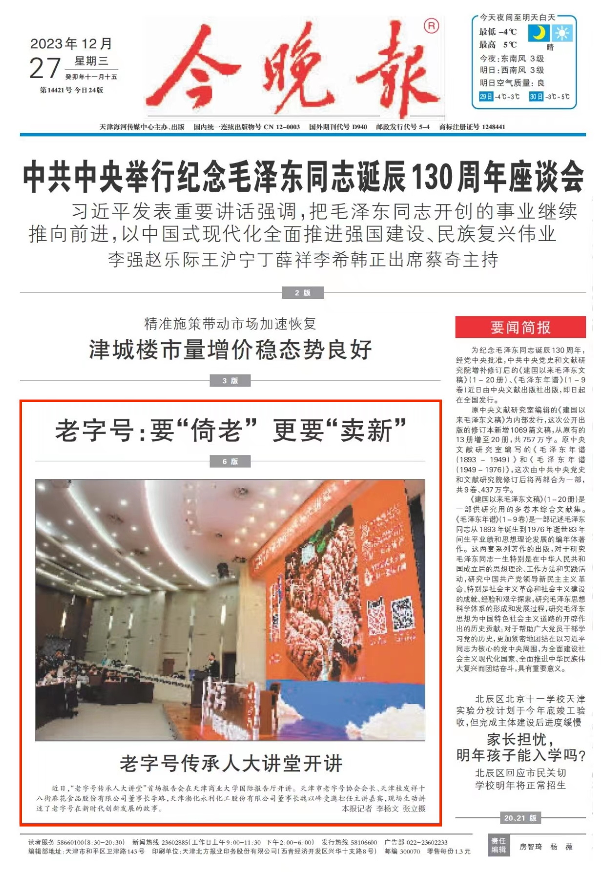 12月27日,《今晚报》头版大图报道学校举办“老字号传承人大讲堂”首场报告会。