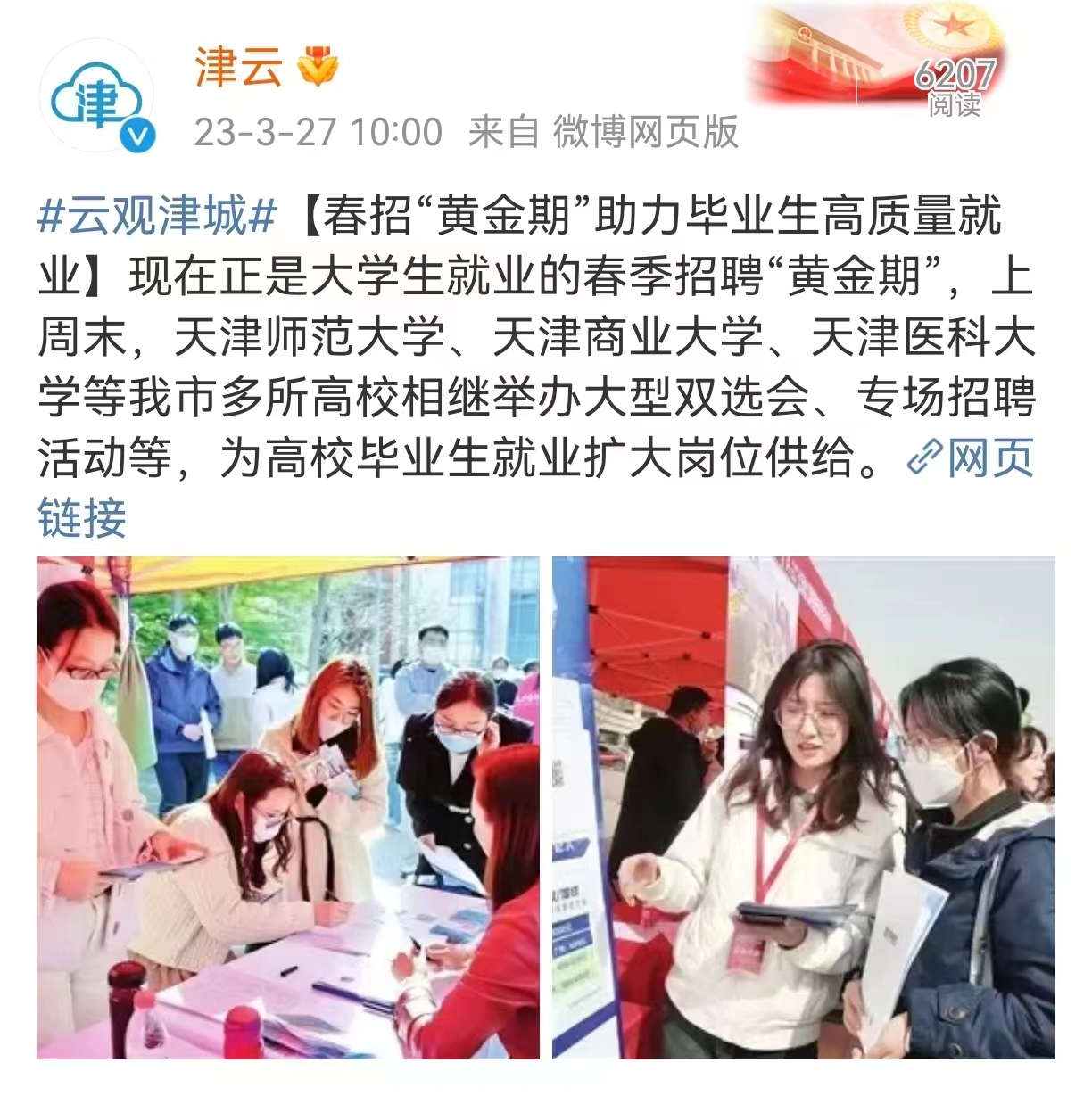 3月27日,《天津日报》、津云微博、市教委微信公众号“津门教育”报道学校举办2023届毕业生春季大型双选会,150家用人单位参会,用人需求达3741人。双选会创新增设了“企业对接洽谈服务 学院包干专区”“一站式求职加油站 学生服务专场”“云端参会不缺席 代收简历服务”等项目,对接企业和用人单位、深化校企合作,面向学生开展贴心暖心、高效便捷的就业指导和服务。