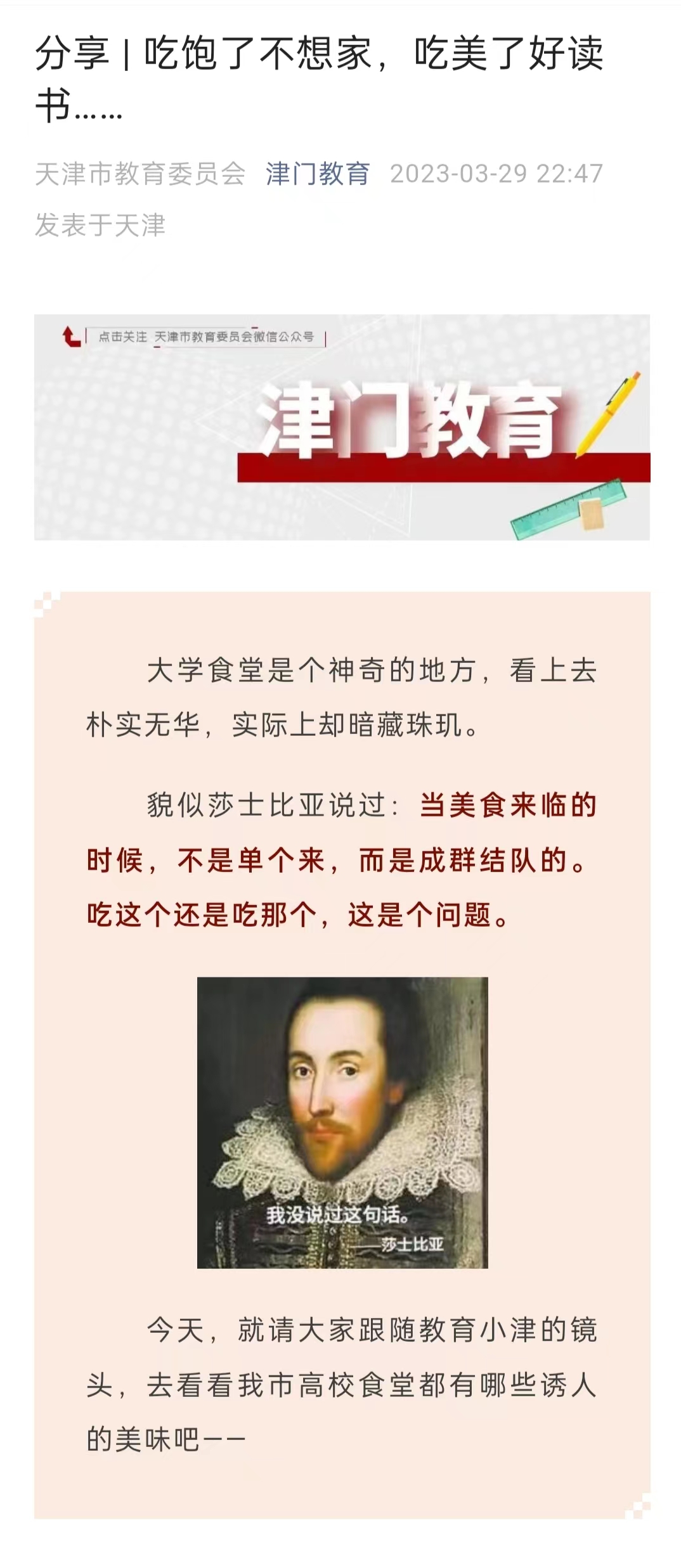 3月29日,市教委微信公众号“津门教育”以“分享 | 吃饱了不想家,吃美了好读书……”报道学校食堂特色餐饮。
