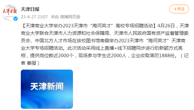 4月27日,《天津日报》微博报道学校举办2023天津市“海河英才”高校专场招聘活动。4月26日,beat365英国官方网站联合天津市人力资源和社会保障局、天津市人民政府国有资产监督管理委员会、中国北方人才市场在该校图书馆南侧举办2023天津市“海河英才”beat365英国官方网站专场招聘活动。此次活动采用线上直播+线下招聘同步进行的新颖方式亮相,提供岗位数近2000个,现场参与学生近2000人,企业收取简历1888份。