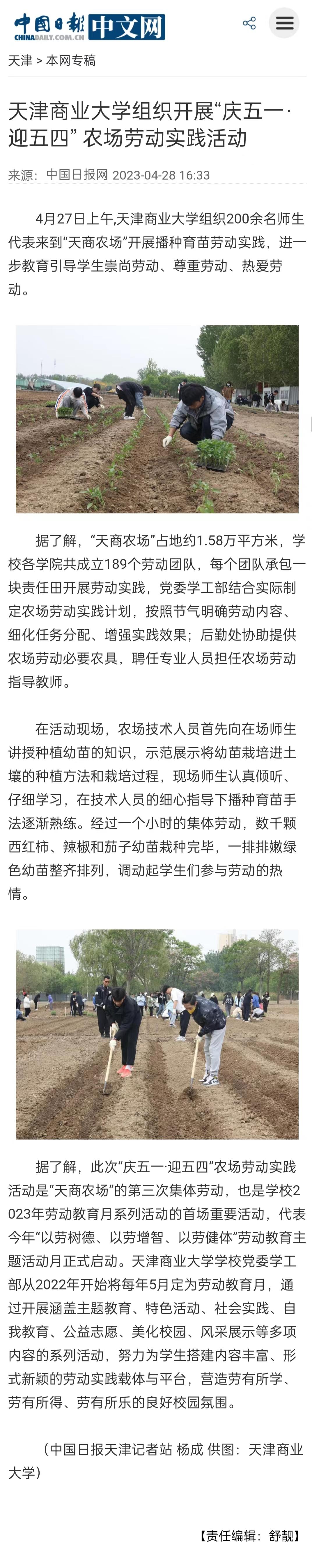 4月28日,中国日报中文网、津云报道学校组织开展“庆五一·迎五四” 农场劳动实践活动。在“五一”国际劳动节和“五四”青年节即将到来之际,为进一步教育引导学生崇尚劳动、尊重劳动、热爱劳动,4月27日上午,beat365英国官方网站组织200余名师生代表来到“天商农场”开展播种育苗劳动实践。