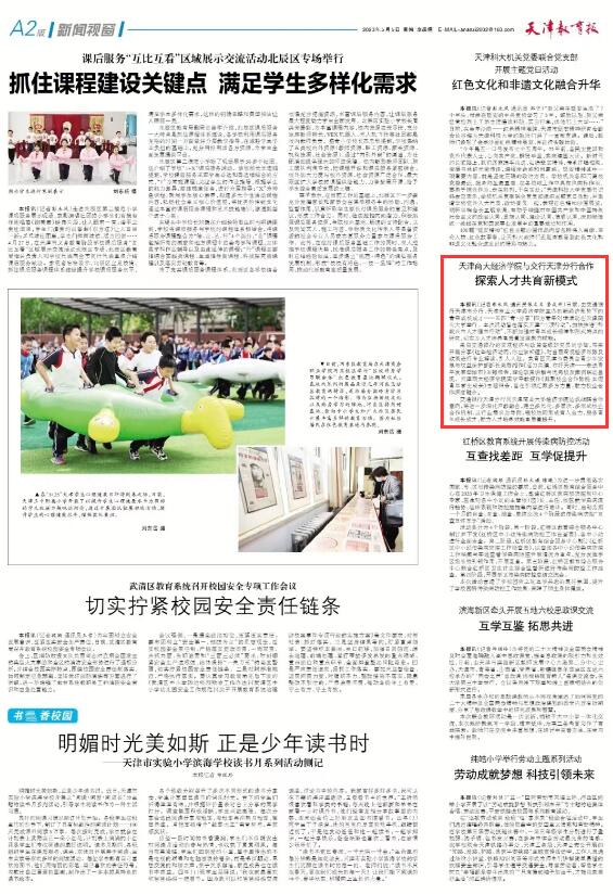 5月5日,《天津教育报》A2版报道学校举办新经济形势下的青年成长成才——五四“青·分享”四方青年对话活动。