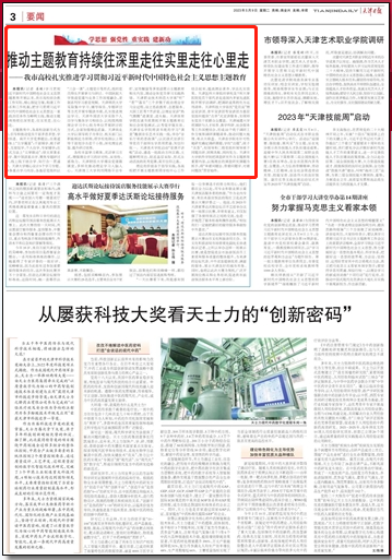 5月9日,《天津日报》第三版报道学校扎实推进学习贯彻习近平新时代中国特色社会主义思想主题教育。