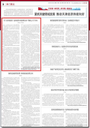 5月26日,《天津日报》“津门策论”主题教育专版刊发副校长黄凤羽教授的理论文章《扩大有效投资 发挥投资对稳增长的“驾辕之马”作用》。