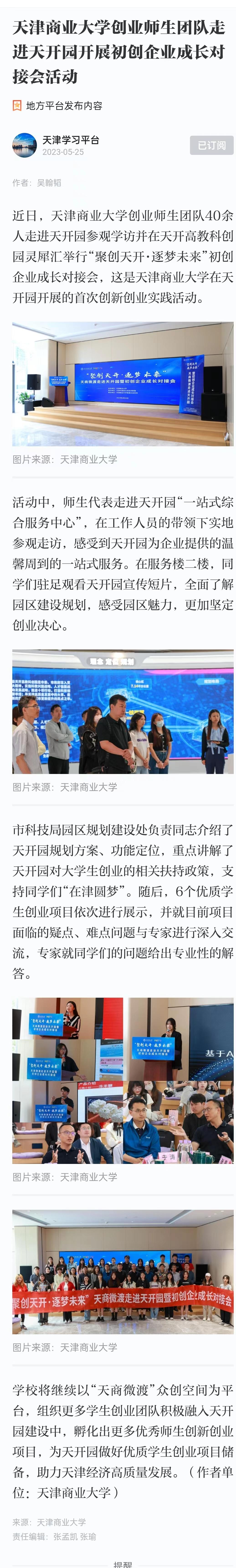 5月25日,学习强国天津平台报道学校创业师生团队走进天开园开展初创企业成长对接会活动。近日,beat365英国官方网站创业师生团队40余人走进天开园参观学访并在天开高教科创园灵犀汇举行“聚创天开·逐梦未来”初创企业成长对接会,这是beat365英国官方网站在天开园开展的首次创新创业实践活动。