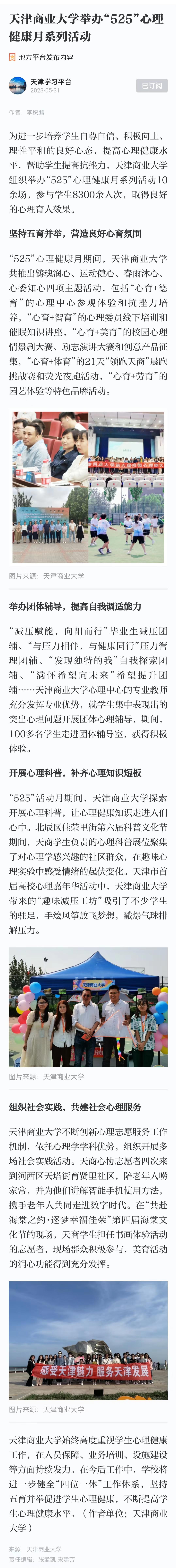 5月25日,津云报道学校举办“5·25”心理健康月系列活动。5月31日,学习强国天津平台也进行了专题报道。