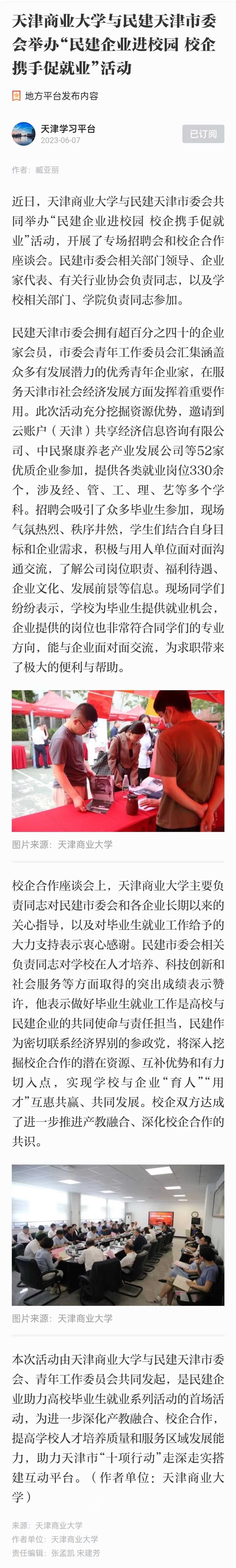 6月7日,学习强国天津平台报道学校与民建天津市委会举办“民建企业进校园 校企携手促就业”活动。近日,beat365英国官方网站与民建天津市委会共同举办“民建企业进校园 校企携手促就业”活动,开展了专场招聘会和校企合作座谈会。民建市委会相关部门领导、企业家代表、有关行业协会负责同志,以及学校相关部门、学院负责同志参加。