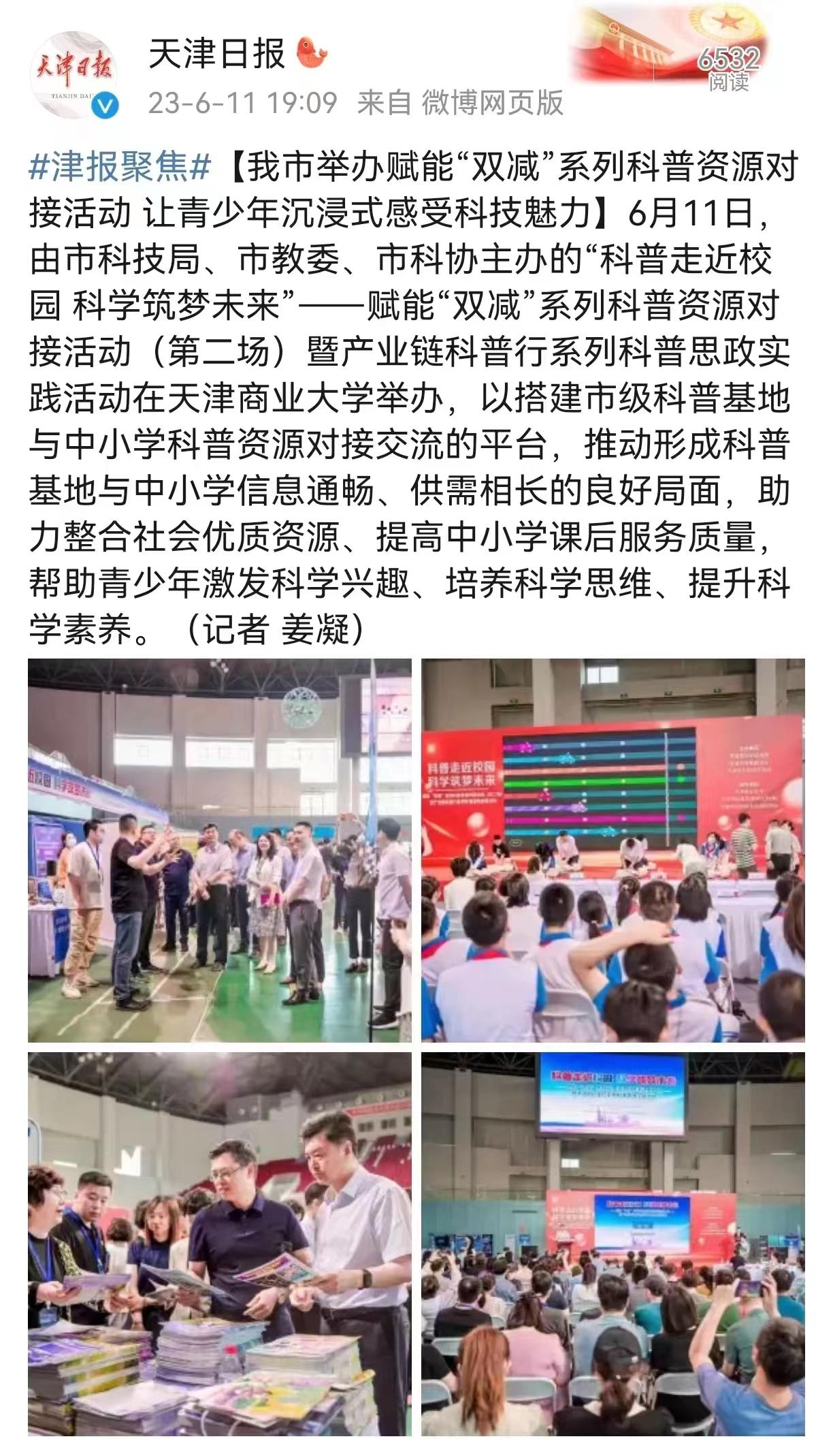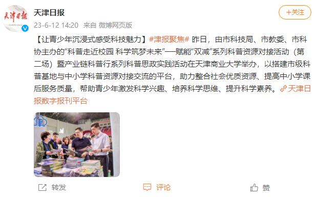 6月11日、12日,《天津日报》、天津日报微博、天津政务网、北方网报道学校举办赋能“双减”系列科普资源对接活动。6月11日,由市科技局、市教委、市科协主办的“科普走近校园 科学筑梦未来”——赋能“双减”系列科普资源对接活动(第二场)暨产业链科普行系列科普思政实践活动在beat365英国官方网站举办,以搭建市级科普基地与中小学科普资源对接交流的平台,推动形成科普基地与中小学信息通畅、供需相长的良好局面,助力整合社会优质资源、提高中小学课后服务质量,帮助青少年激发科学兴趣、培养科学思维、提升科学素养。
