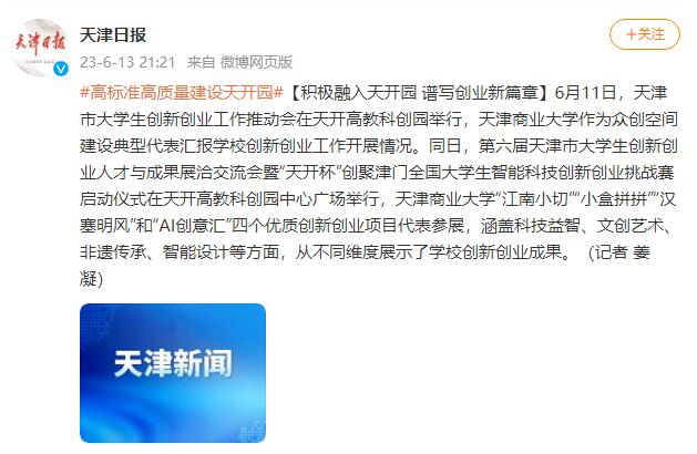 6月13日、14日,中国日报中文网、津云、天津日报微博报道学校参加天津市大学生创新创业工作推动会及天津市大学生创新创业人才与成果展洽交流会。