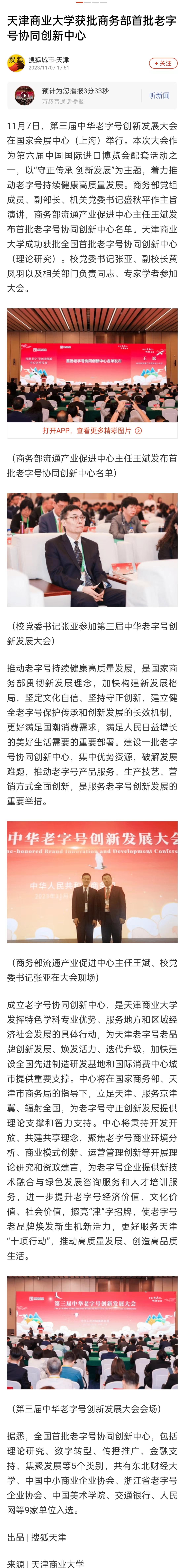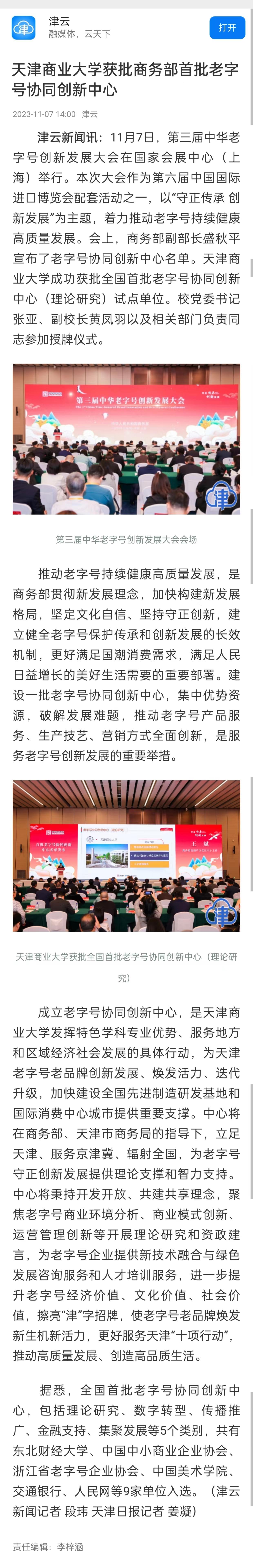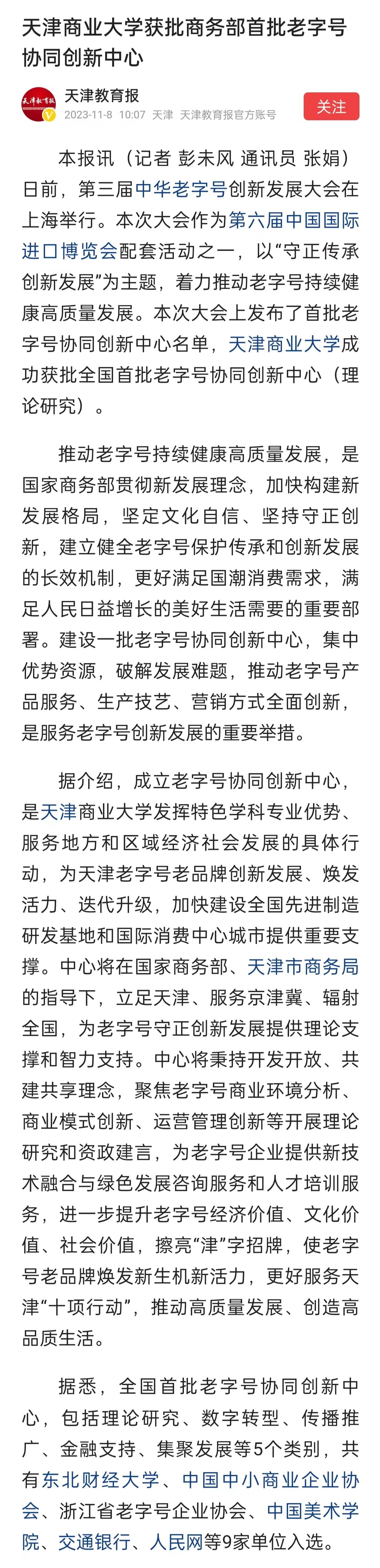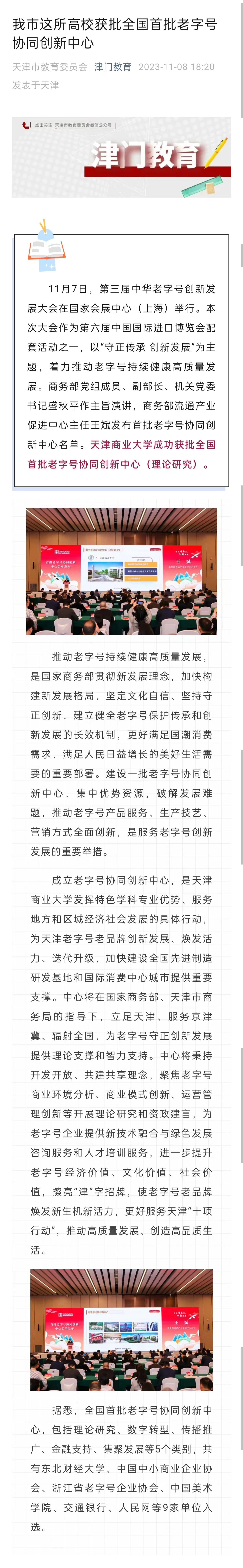 11月7日至8日,中国日报网、津云、《天津教育报》头条号、搜狐网、津门教育微信公众号报道beat365官网获批商务部首批老字号协同创新中心。日前,第三届中华老字号创新发展大会在上海举行。本次大会作为第六届中国国际进口博览会配套活动之一,以“守正传承 创新发展”为主题,着力推动老字号持续健康高质量发展。本次大会上发布了首批老字号协同创新中心名单,beat365英国官方网站成功获批全国首批老字号协同创新中心(理论研究)。