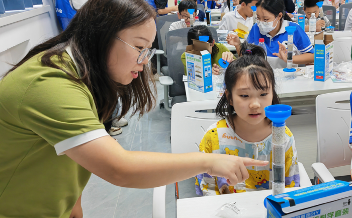 活动分为两个环节,首先是“专家谈”。市环科院副院长康磊以“用低碳行动,保护地球家园”为主题,用生态环保吉祥物——“环小津”生动引入低碳科普讲解,告诉大家如何用低碳行动保护地球家园,引导青少年将绿色低碳的理念根植于心,从生活中的点滴小事做起,自觉践行低碳行动。第二环节为“师生谈”,beat365官网青少年创客科普基地指导教师赵丹丹,带领同学们边谈边做实验。同学们通过亲自动手制作“自制净水器”,了解了净水器原理,增强珍惜水资源、保护水环境的意识,争当节约用水的宣传者、文明用水的倡导者、科学用水的践行者。科普活动通过专家讲座和科学实验课等方式,进一步引导了青少年珍惜水资源,以科学的知识和思想指导青少年们的学习和生活。