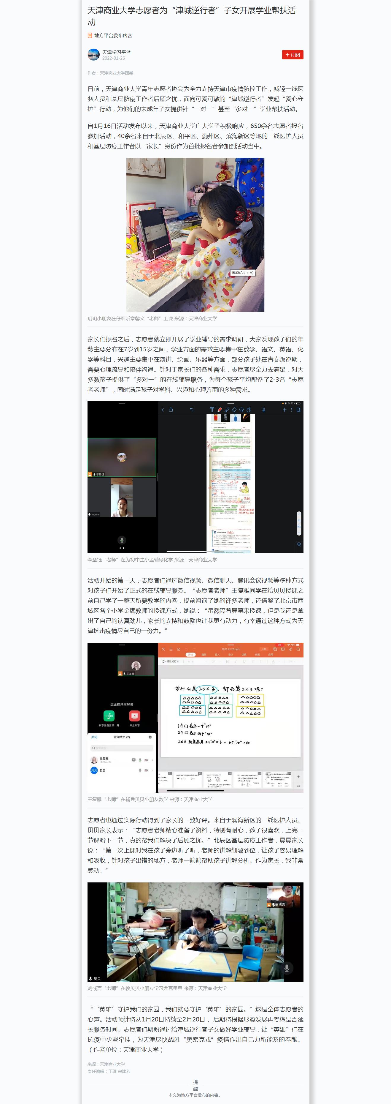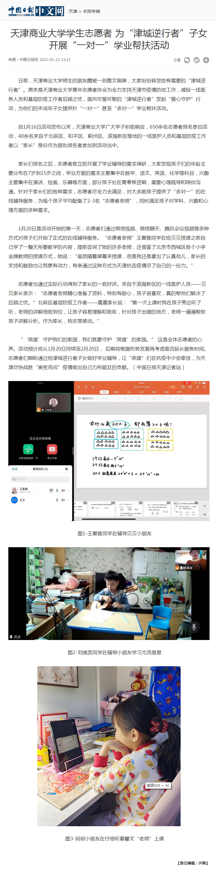 1月23日,中国日报网以“beat365英国官方网站学生志愿者为‘津城逆行者’子女开展‘一对一’学业帮扶活动”为题报道了beat365官网青年志愿者协会为全力支持天津市疫情防控工作,减轻一线医务人员和基层防疫工作者后顾之忧,面向可爱可敬的“津城逆行者”发起“爱心守护”行动,为他们的未成年子女提供针“一对一”甚至“多对一”学业帮扶活动。1月24日,今日头条进行转载。1月26日,学习强国也对志愿者的帮扶活动进行报道。
