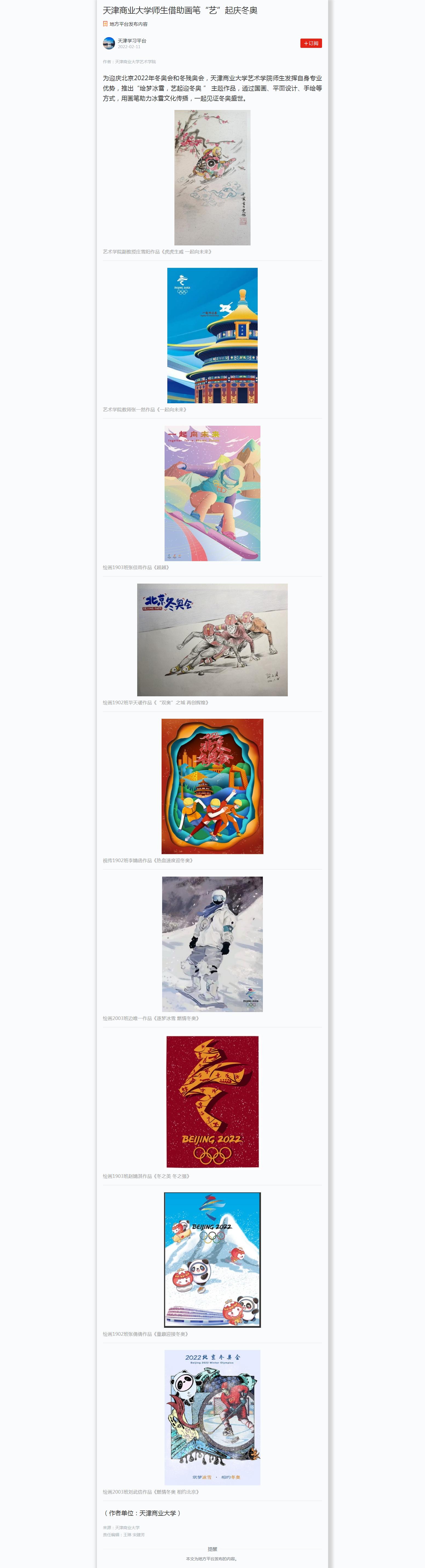 2月2日,新华网以“天津高校师生以艺术海报助力冬奥”为题报道beat365官网艺术学院视传1902 班李婧函的《热血速度迎冬奥》主题作品。2月3日,津云客户端对beat365官网“ 绘梦冰雪,艺起迎冬奥 ” 主题线上作品展进行专题报道。2月11日,学习强国天津学习平台也以“beat365英国官方网站师生借助画笔‘艺’起庆冬奥”为题对beat365官网艺术学院师生的主题作品进行报道。