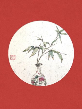 红竹,谦逊、刚正、风骨之竹;牡丹,富贵、吉祥、典雅;玉壶春瓶,中国传统样式。三两枝红竹,插于瓶中,并借花瓶上的牡丹图案,点出春至花开的主题。竹报平安,花开富贵,祈愿国泰民安。