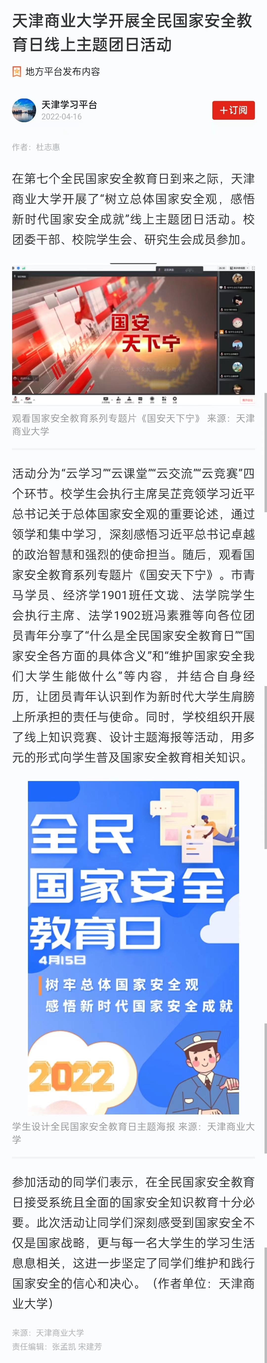 4月16日,学习强国天津平台报道beat365官网开展了“树立总体国家安全观,感悟新时代国家安全成就”线上主题团日活动。