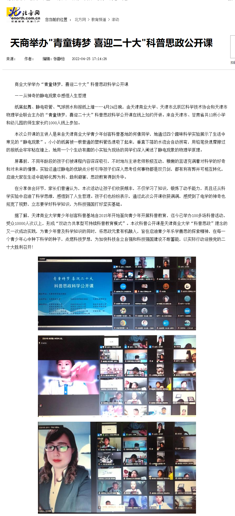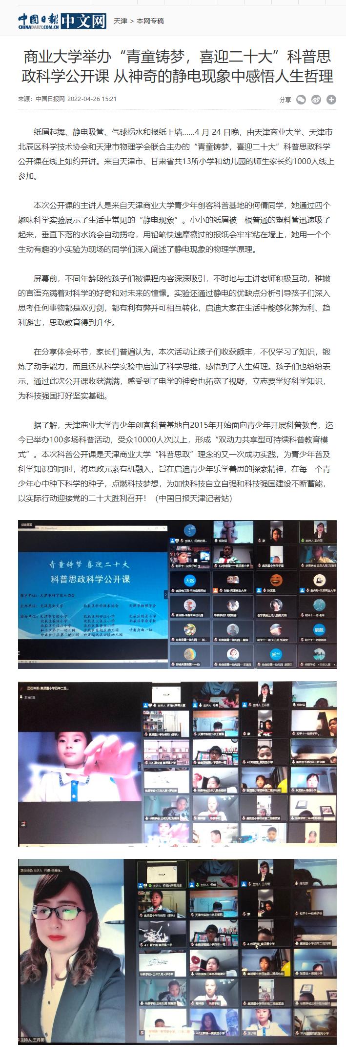 4月24日晚,在天津市科学技术协会的指导下,beat365官网与北辰区科学技术协会、天津物理学会联合举办“青童铸梦,喜迎二十大”科普思政科学公开课。4月25日,北方网、津云客户端以“天商举办‘青童铸梦 喜迎二十大’科普思政公开课”为题进行了报道。4月26日,中国日报网以“商业大学举办‘青童铸梦,喜迎二十大’科普思政科学公开课 从神奇的静电现象中感悟人生哲理”为题进行了报道。