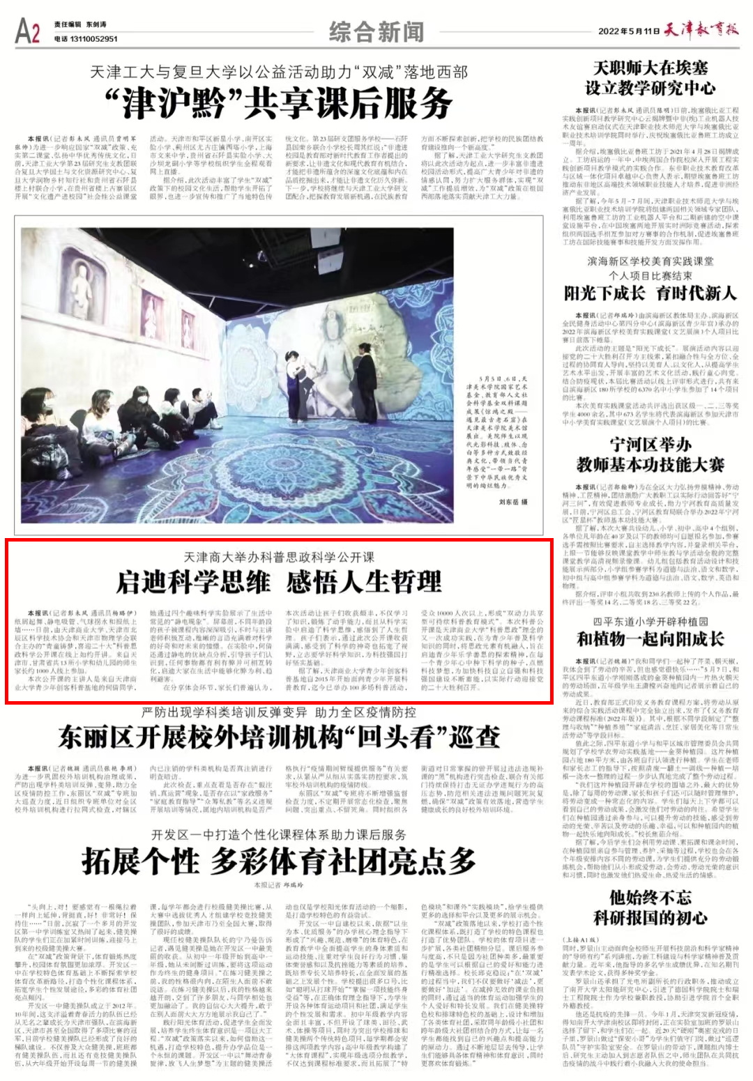 5月11日,《天津教育报》报道beat365官网、天津市北辰区科学技术协会和天津市物理学会联合主办的“青童铸梦,喜迎二十大”科普思政科学公开课在线上如约开讲。