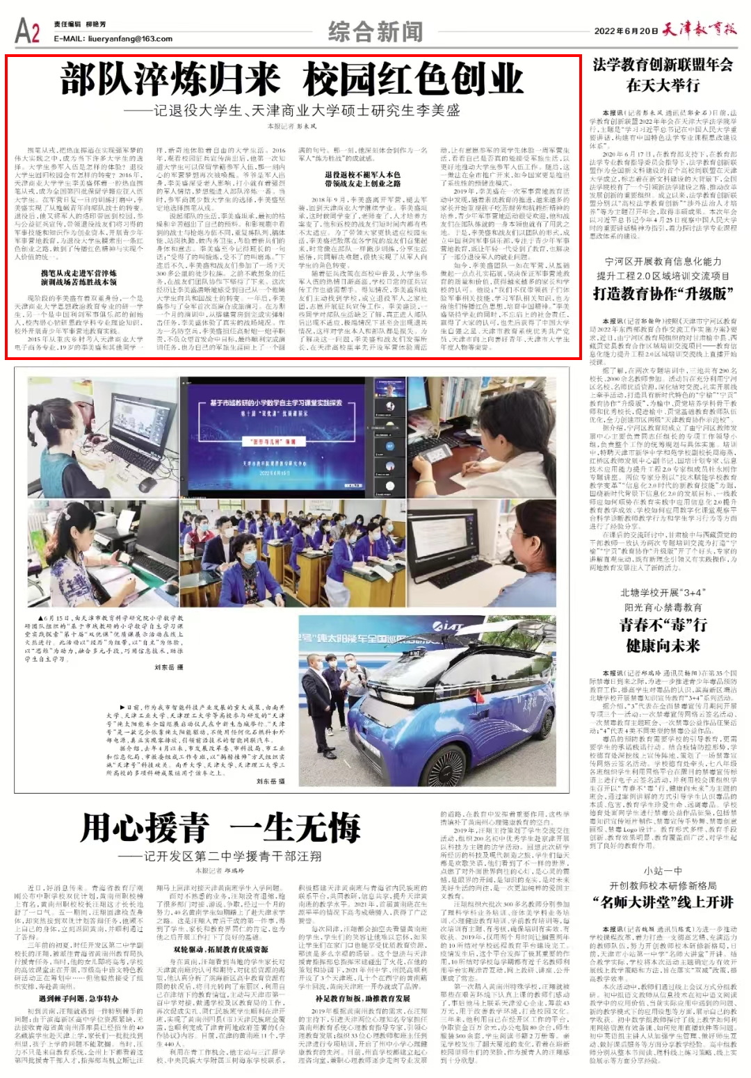 6月20日,《天津教育报》A2版报道beat365官网退役大学生李美盛先进事迹。2016年,beat365英国官方网站学生李美盛怀着一腔热血携笔从戎,成为全国第四批保留学籍应征入伍大学生。在军营日复一日的训练打磨中,李美盛实现了从稚嫩青年向部队战士的转变。退役后,他又将军人的烙印带回到校园,参与公益征兵宣传,带领退役战友们将习得的军事技能和知识作为创业资本,开展青少年军事营地教育,为退役大学生摸索出一条红色创业之路,做到了传播红色精神与实现个人价值的统一。