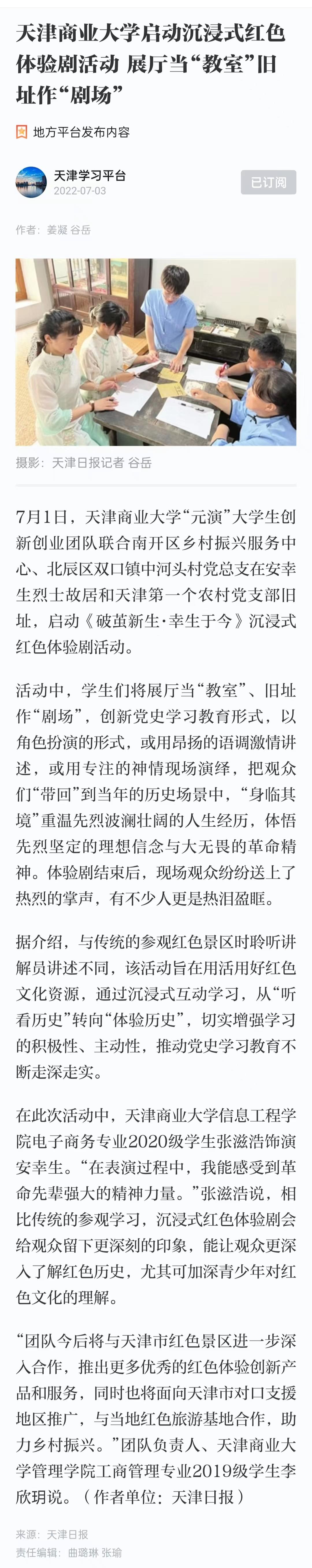 日前,央广网、学习强国、津云客户端、《天津日报》、《天津教育报》、天津新闻报道beat365官网开展沉浸式红色体验剧主题活动。7月1日,beat365英国官方网站“元演”大学生创新创业团队联合南开区乡村振兴服务中心和北辰区双口镇中河头村党总支在安幸生烈士故居和天津农村第一党支部旧址,启动《破茧新生• 幸生于今》沉浸式红色体验剧主题活动。来自beat365英国官方网站、南开区乡村振兴服务中心和中河头村的30余名党员和群众参与体验活动。