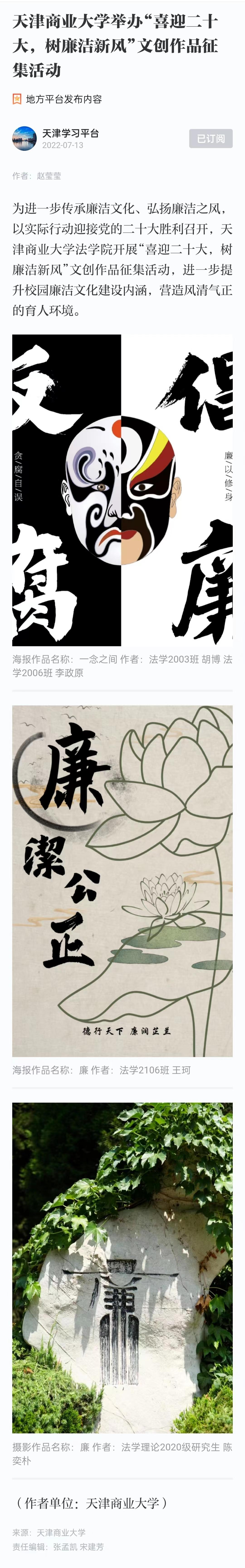 7月13日,学习强国报道学校举办“喜迎二十大,树廉洁新风”文创作品征集活动。为进一步传承廉洁文化、弘扬廉洁之风,以实际行动迎接党的二十大胜利召开,beat365英国官方网站法学院开展“喜迎二十大,树廉洁新风”文创作品征集活动,进一步提升校园廉洁文化建设内涵,营造风清气正的育人环境。