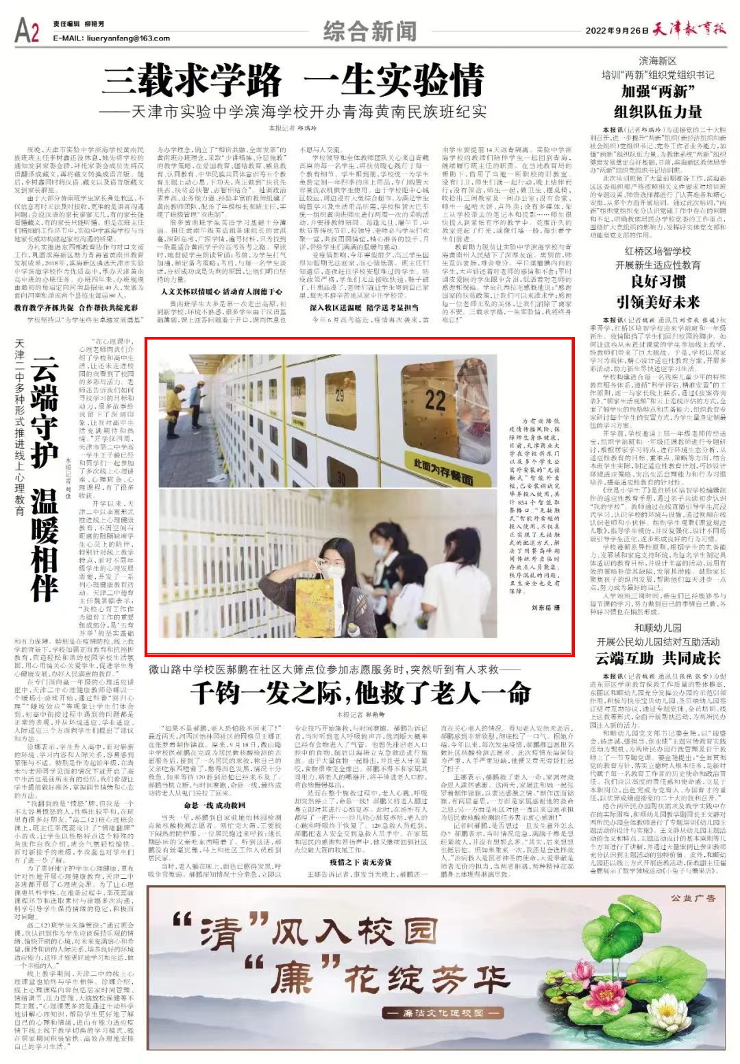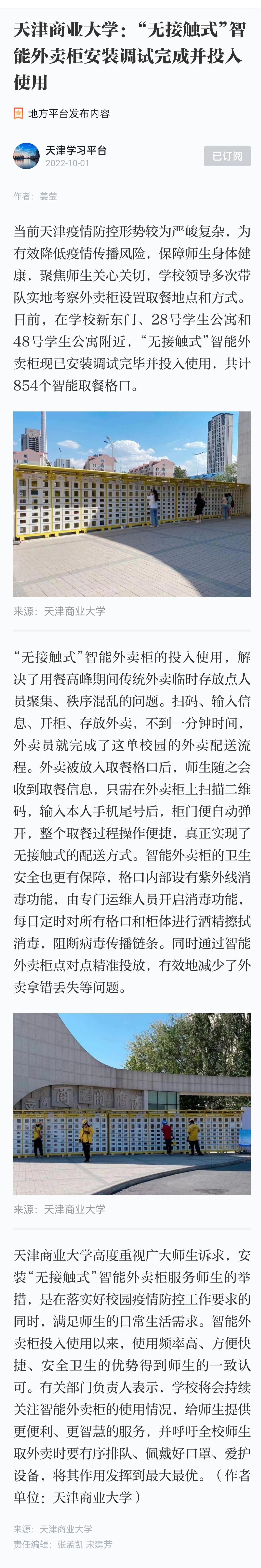 9月26日,《天津教育报》A2版报道beat365官网“无接触式”智能外卖柜安装调试完成并投入使用。10月1日,学习强国天津平台也进行了专题报道。