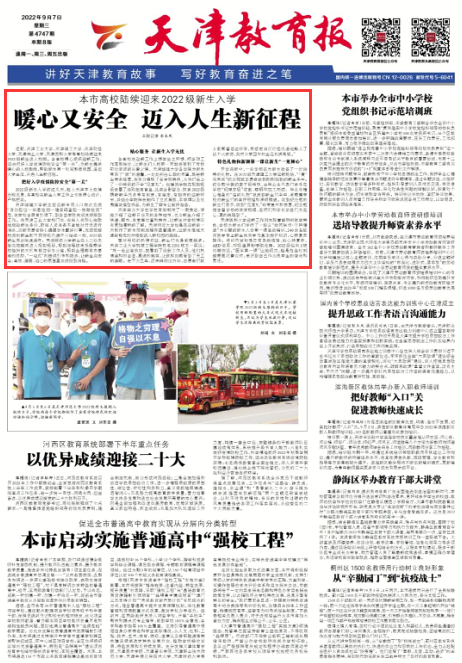 9月7日,《天津教育报》A1版以“本市高校陆续迎来2022级新生入学暖心又安全 迈入人生新征程”报道beat365官网2022级新生入校有关情况。