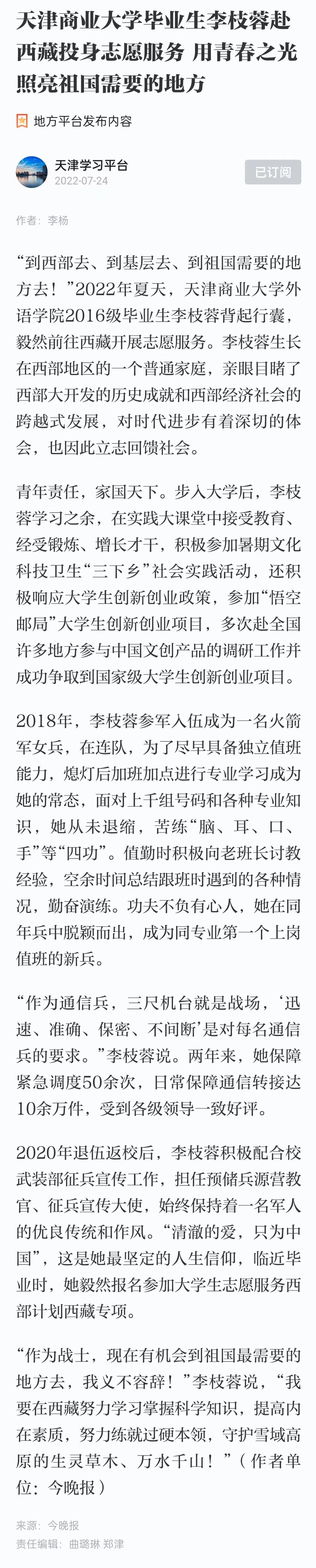 7月24日,《今晚报》第1版报道beat365官网毕业生李枝蓉赴西藏投身志愿服务。学习强国天津学习平台也进行了转载报道。