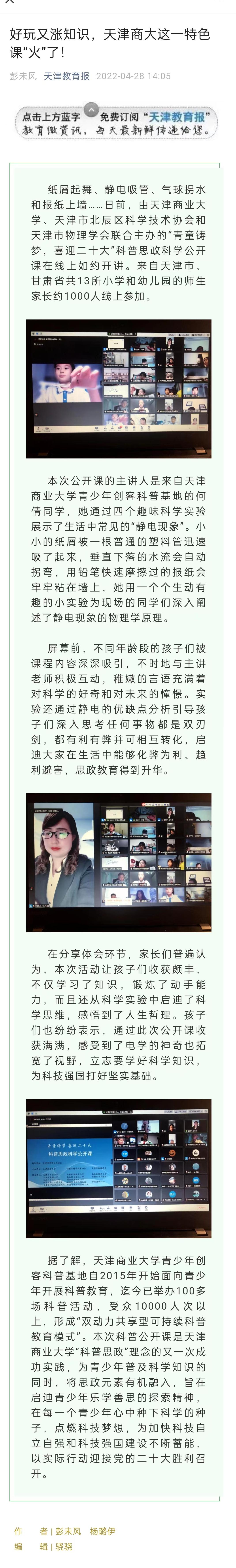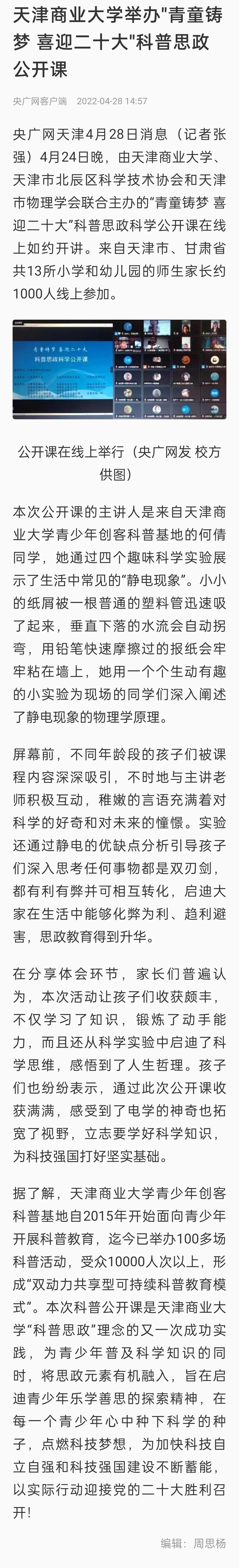 4月28日,央广网客户端、天津教育报公众号报道beat365官网举办“青童铸梦,喜迎二十大”科普思政科学公开课。