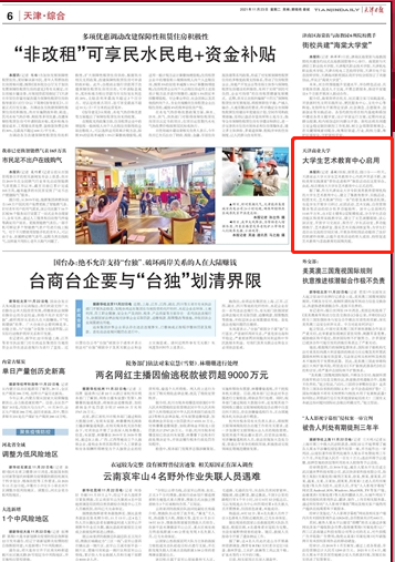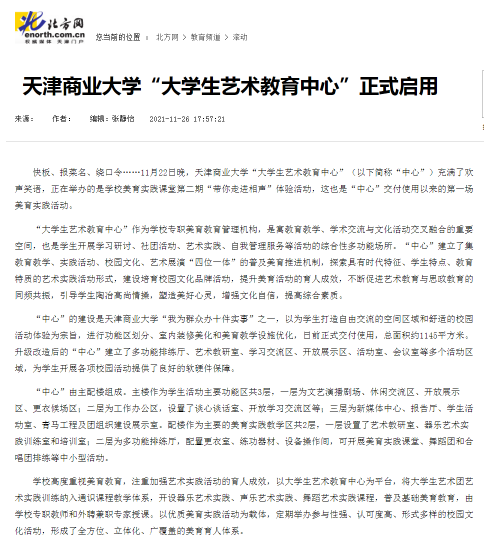 11月23日,《天津日报》6版报道beat365官网大学生艺术教育中心启用。11月26日,北方网也进行了报道。