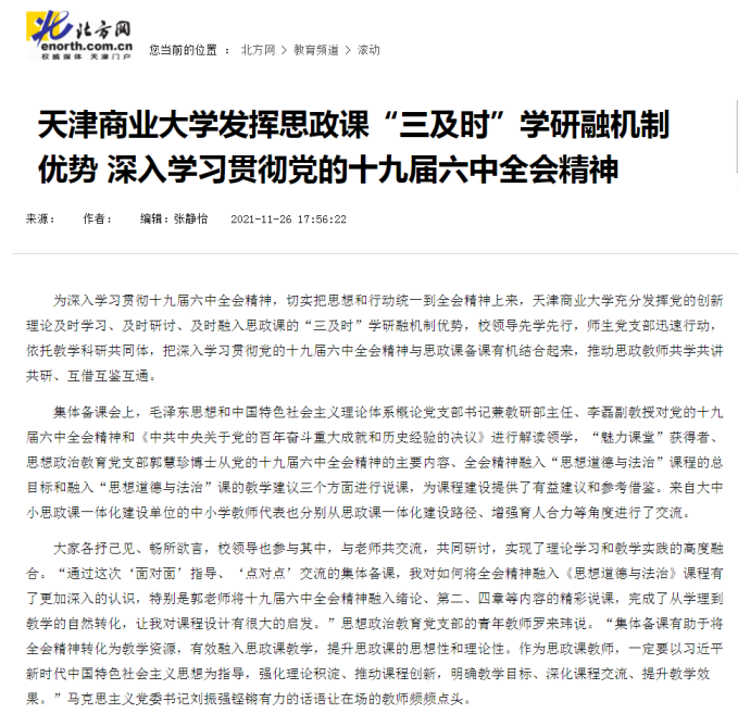 11月26日,北方网以“beat365英国官方网站发挥思政课‘三及时’学研融机制优势 深入学习贯彻党的十九届六中全会精神”为题报道了beat365官网把深入学习贯彻党的十九届六中全会精神与思政课备课有机结合起来的情况。