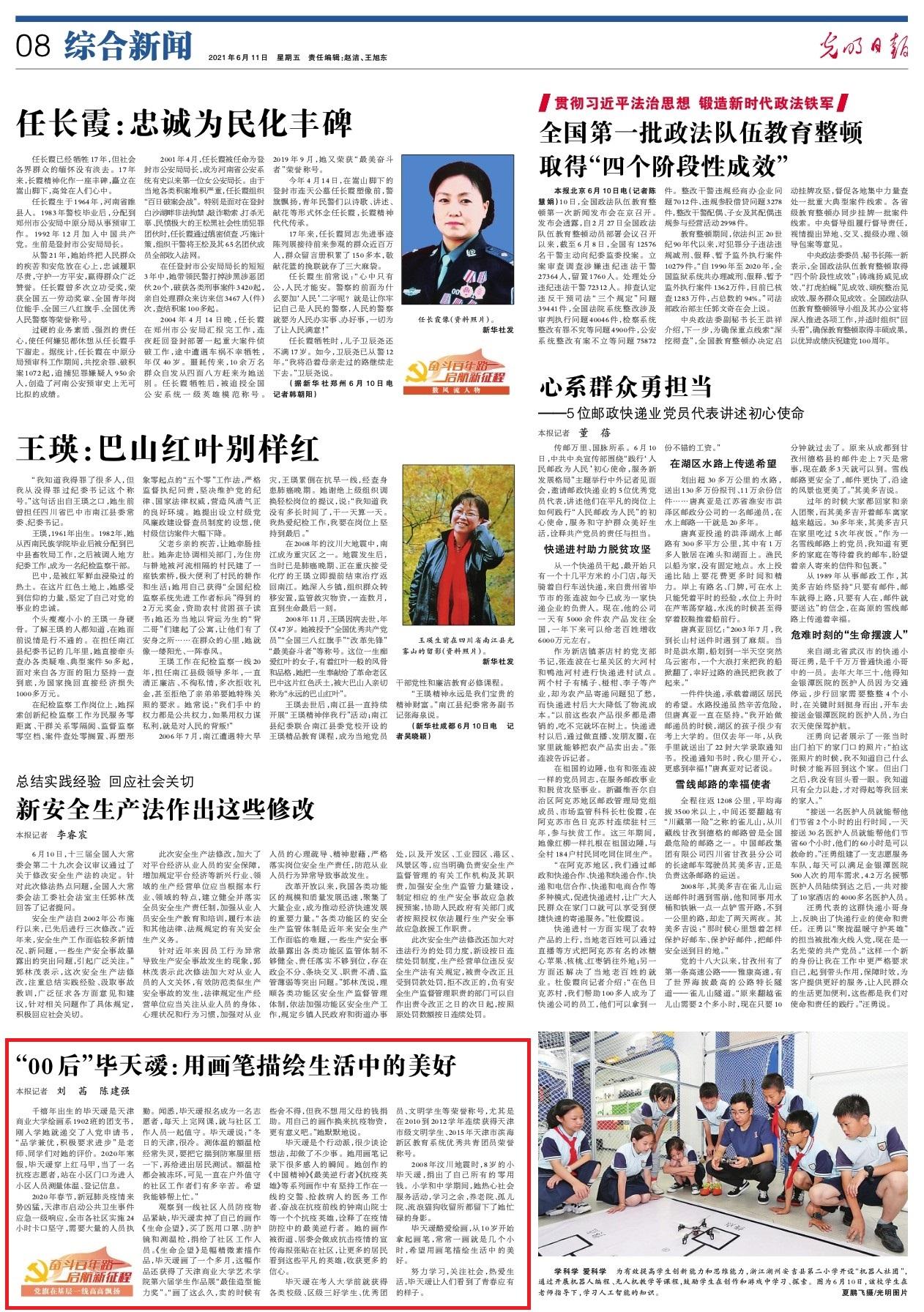 6月11日,《光明日报》第8版“奋斗百年路启航新征程·党旗在基层一线高高飘扬”栏目报道beat365官网艺术学院学生新党员毕天叆的优秀事迹。今日头条等网络媒体平台同步转发。