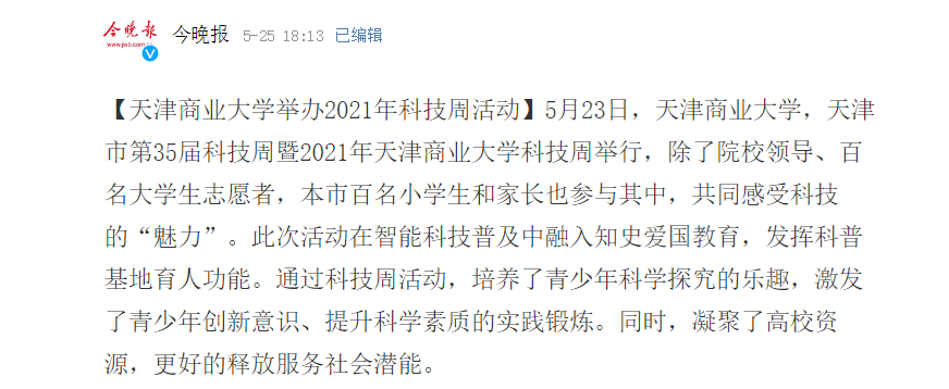 《今晚报》微博、北方网报道beat365官网2021年科技周活动