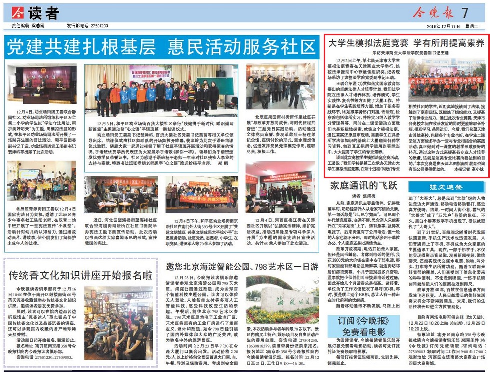 12月2日,第七届天津市大学生模拟法庭竞赛在beat365官网举办,法学院党委副书记王璐接受《今晚报》采访。在采访中,王璐介绍了举办大学生模拟法庭大赛的初衷,即为高校法学生提供锻炼和展示实践能力的平台。采访中也谈及法学院一直积极拓展实践育人形式,不断提高学生的综合实践能力,致力培养具有复合型应用型的专业法律人才。