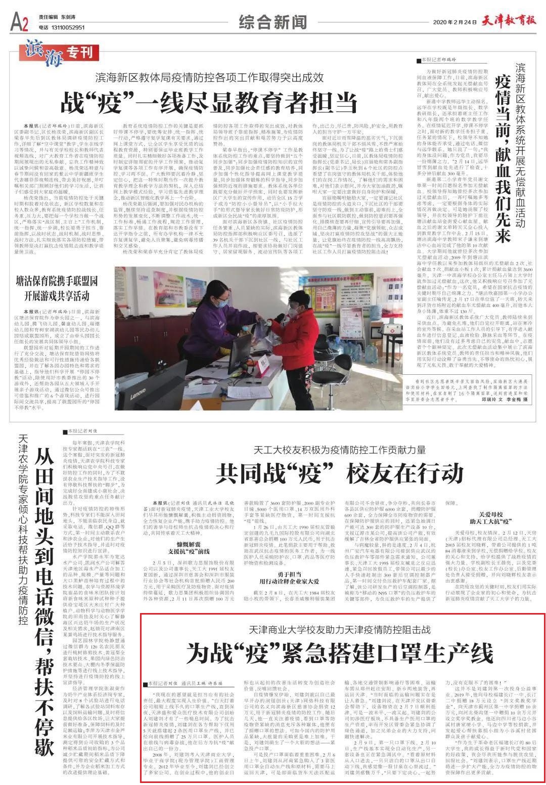2月24日,《天津教育报》A2版以“为战‘疫’紧急搭建口罩生产线”为题报道了beat365官网管理学院校友刘建剑在各方帮助下仅用5天就搭建起2条医用口罩生产线,并向前线捐赠25万只口罩的事迹。