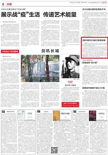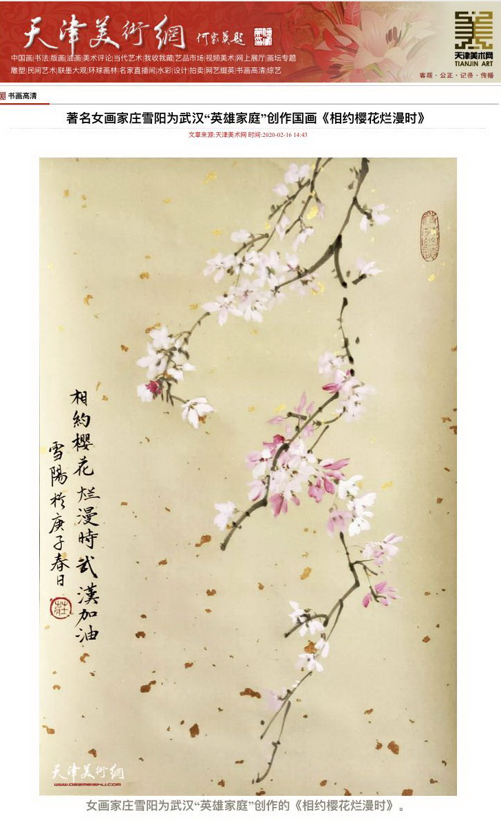 2月16日,天津美术网以“著名女画家庄雪阳为武汉‘英雄家庭’创作国画《相约樱花烂漫时》”为题报道了beat365官网艺术学院庄雪阳副教授创作国画樱花图献给一线的英雄,希望用中国艺术意向造型,表达对战胜疫情的坚定决心和对美好未来的憧憬。2月26日,《天津日报》9版也以“《相约樱花烂漫时》致敬英雄”为题进行报道。