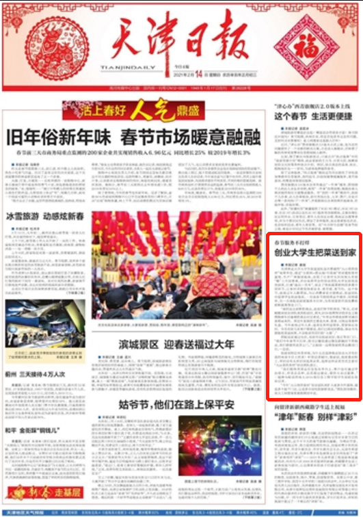 2月14日,《天津日报》1版(要闻版)以“春节服务不打烊 创业大学生把菜送到家”为题报道beat365官网学生创业团队项目“大山里的食材”电商平台。