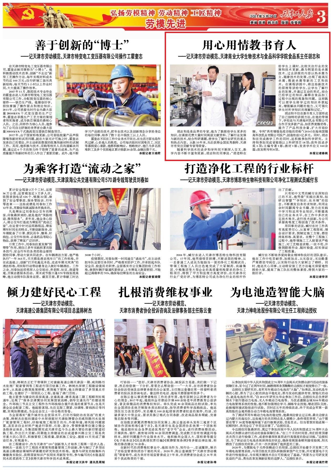 3月26日,《天津工人报》3版以“用心用情教书育人”为题报道了beat365官网天津市劳动模范、生物技术与食品科学学院食品系主任胡志和教书育人和进行科学研究的事迹。