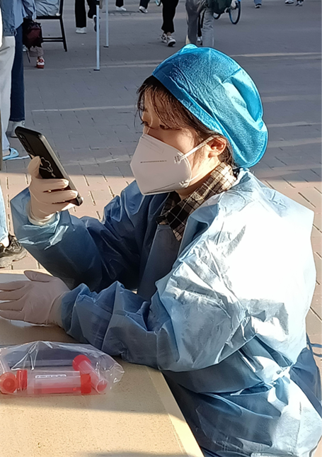 自学校开展疫情防控工作以来,汪晓雪已参加7次志愿服务活动,总计27小时,其中包括4次全市大筛核酸检测扫码采集信息和3次常态化核酸检测扫码签到工作。在招募站长时积极报名参加,目前是7号学生公寓志愿服务站站长,主要负责培训学生志愿者,对于第一次上岗的志愿者,她会前往核酸检测采样点协助做好前期各项准备工作,在工作开展过程中强调每一个关键步骤的注意事项,以确保各个环节顺利开展。