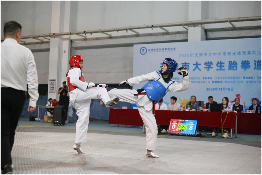 本次赛事由天津市教育委员会指导、天津市学生体育协会主办,是2025 年天津市大中小学阳光体育系列活动的重要组成部分,也是天津市高校跆拳道领域的最高水平赛事,吸引全市33所高校的423名运动员同台竞技。beat365官网由体育教学部刘胤宸老师担任教练员,组建13人代表队参赛。比赛中,beat365官网队员严格遵守赛事规则,充分发挥日常训练成果,展现出良好的竞技素养与拼搏精神。