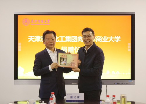 王俊明代表渤化集团将标志中华老字号历史的发明证书和专利证书拓本及贡盐砖样本捐赠给了学校。张亚代表学校向渤化集团颁发了捐赠证书。