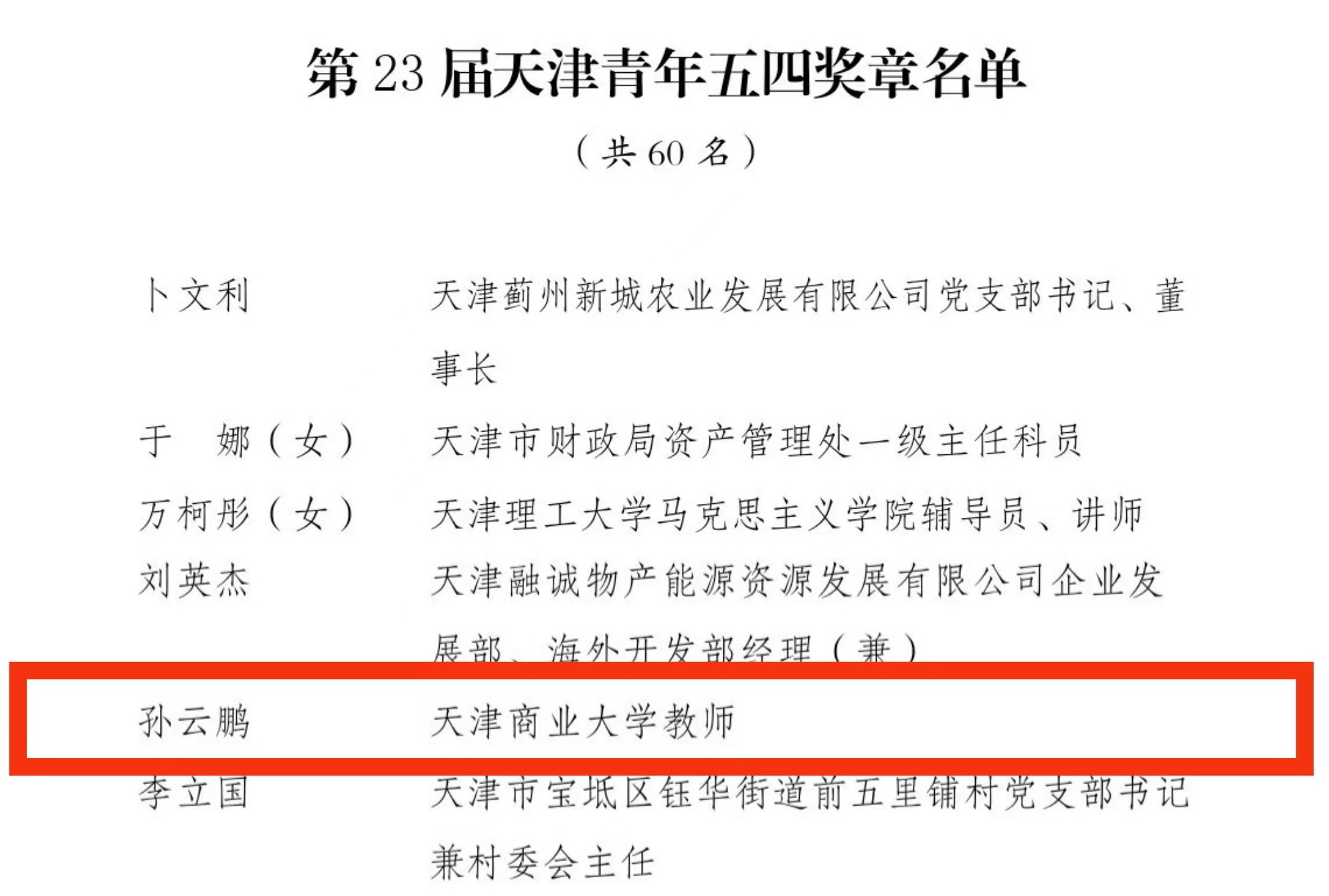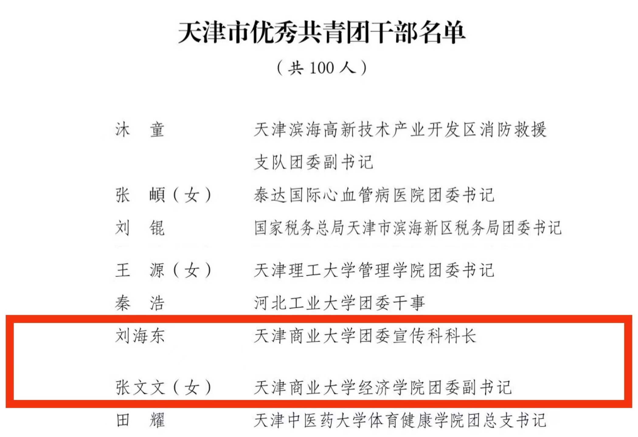 “天津市优秀共青团干部”获得者、经济学院团干部张文文,扎实做好基础团务工作,以团学组织为抓手,指导学生组织开展校园文化活动。以“挑战杯”为龙头,积极组织学生参与国家级、省市级各类学科竞赛,学生屡获奖项。积极开展暑期社会实践,团队事迹被人民日报等国家级媒体报道。多次获评校级优秀共青团干部等荣誉称号。