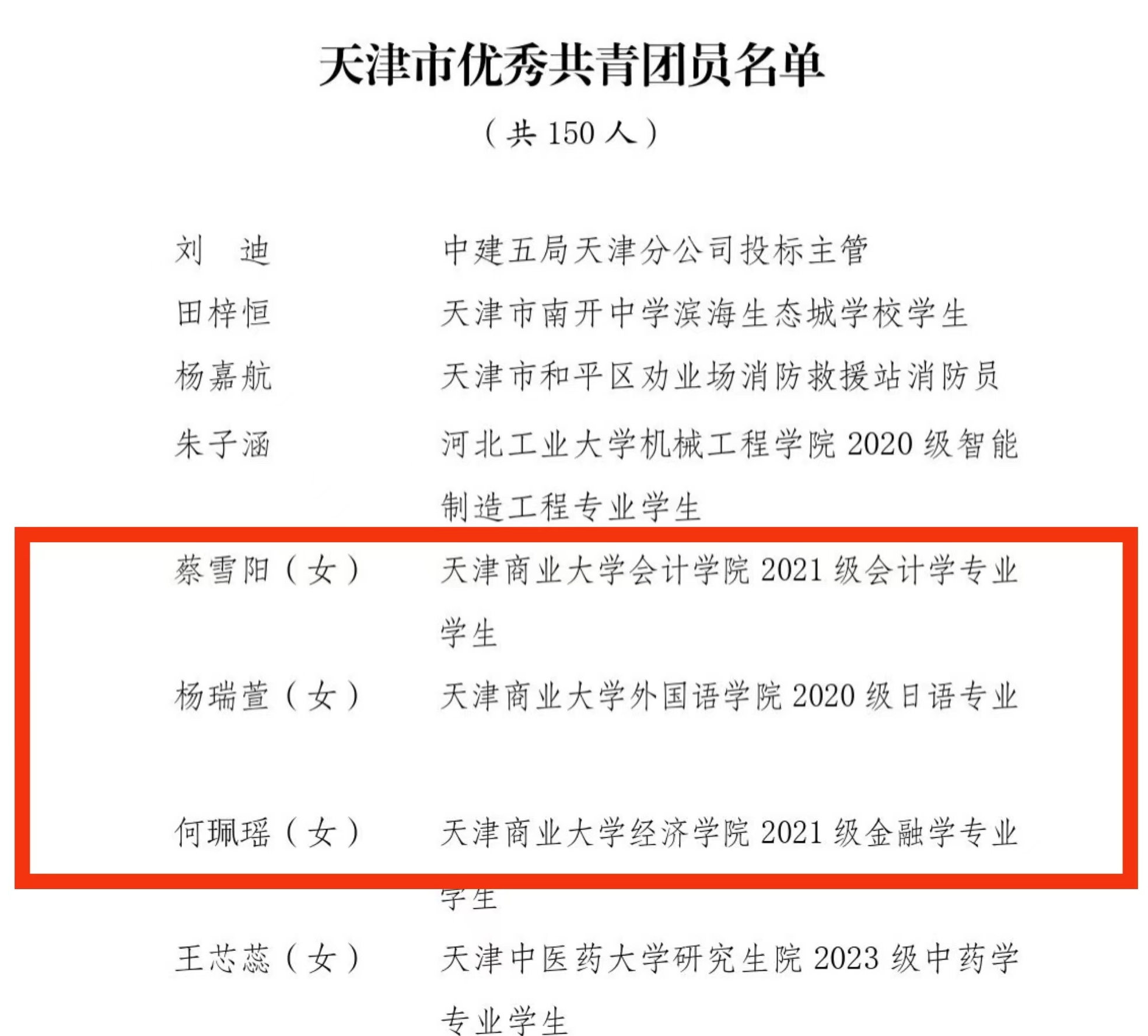 “天津市优秀共青团员”获得者、会计学院会计学2103班蔡雪阳,现任校学生会执行主席、班级团支部副书记兼班长。作为市学代会代表,带领学生会获评天津市学生联合会委员会团体单位,并被聘任为天津市学联第二届“强国有我”理论宣讲团成员。作为校学生会执行主席,组织多场校园文化活动;作为班长,带领班级获得“先进班集体”荣誉称号。她勤勉认真,学业绩点4.29;积极参加学科竞赛,荣获多项市级荣誉。