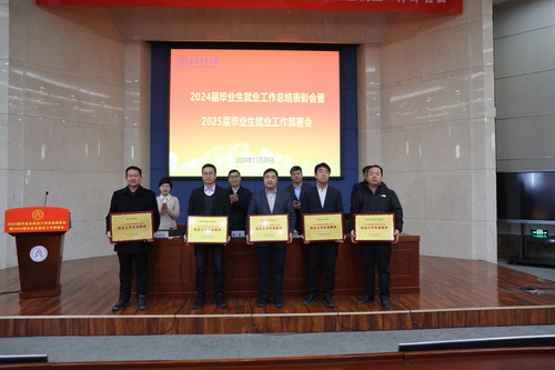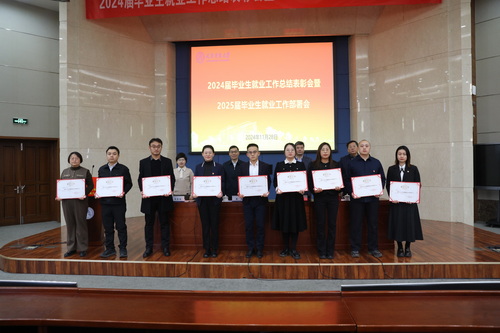 王立云传达上级就业创业会议精神并作工作部署。齐恩平宣读表彰2024年度就业工作先进集体、先进个人的决定。校领导为2024年度就业工作先进集体、先进个人颁发奖牌、证书。